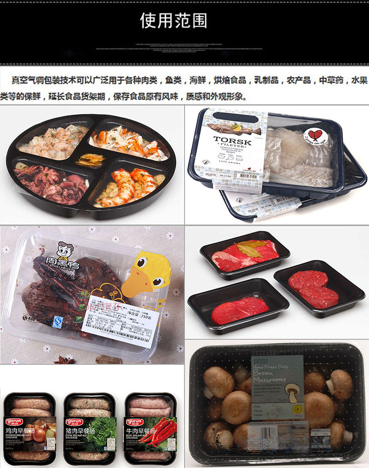 真空氣調(diào)包裝技術(shù)可以廣泛應(yīng)用于各種肉類,魚類,海鮮,烘焙食品,乳制品,農(nóng)產(chǎn)品,中草藥,水果類等的保鮮,延長食品貨架期