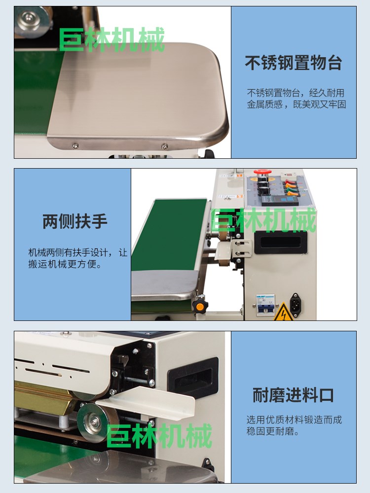 本機(jī)是新一代集印碼,封口,連續(xù)輸送為一體的自動(dòng)薄膜封口機(jī),具有印字清晰、顔色可選、即印即干、換字方便等特點(diǎn)。